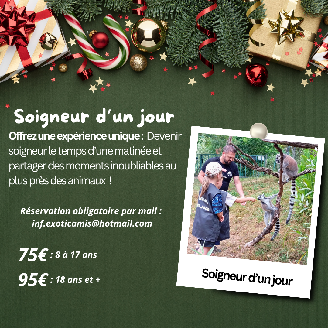Soigneur d’un jour : immersion aux côtés des soigneurs (75 € pour les 8–17 ans, 95 € pour les adultes).
