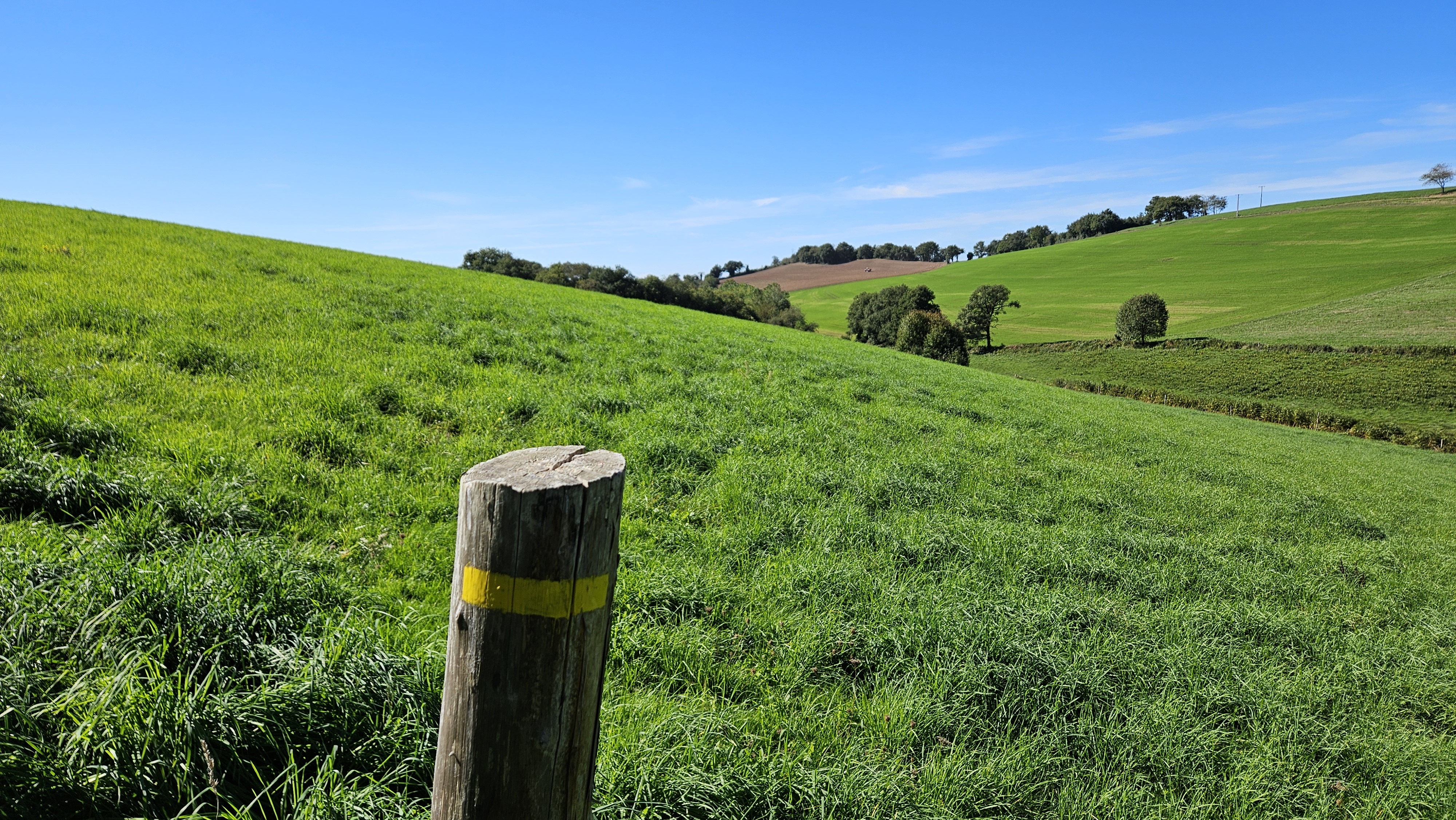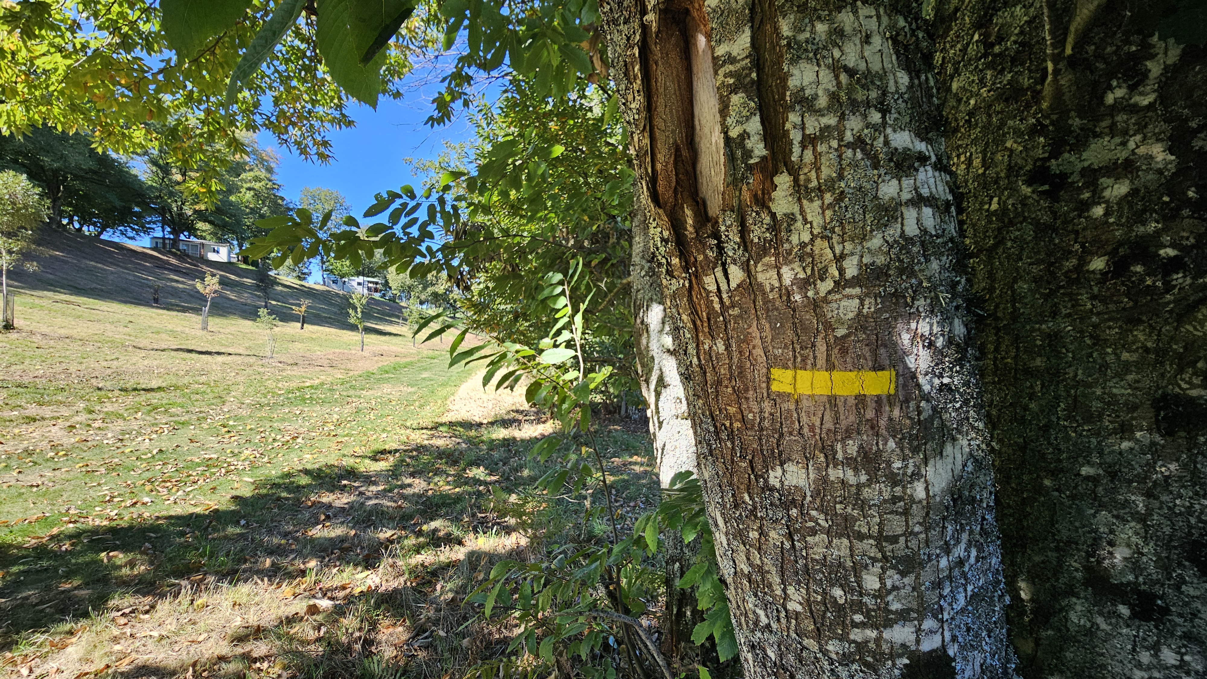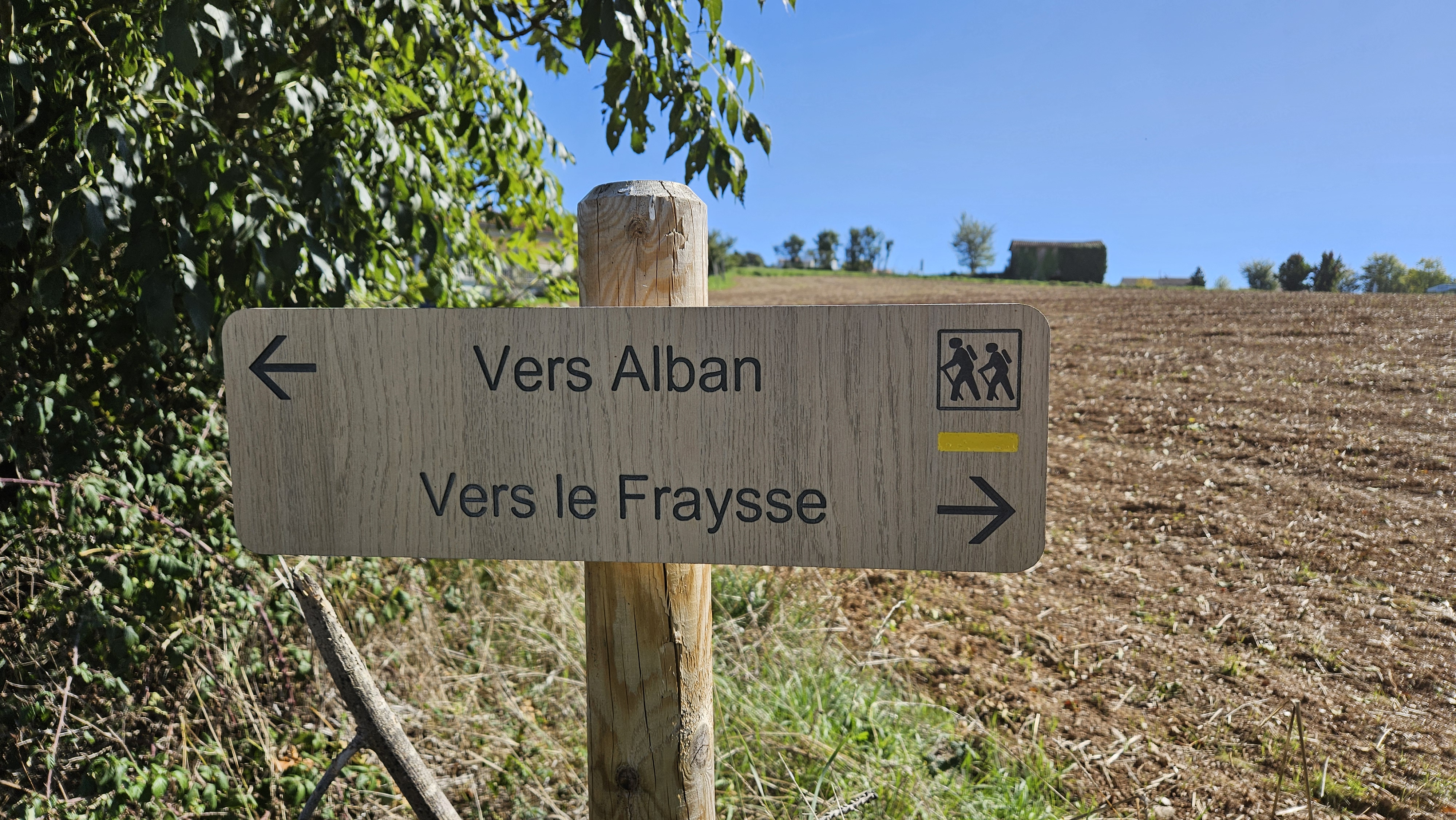 • À droite, traversez le hameau de Ginestous pour rejoindre la liaison pédestre Alban / Le Fraysse. Vous pourrez alors effectuer un aller-retour ou découvrir le hameau du Fraysse et prolonger votre balade par le sentier Camin de Comba Granda (boucle de 11,5 km).