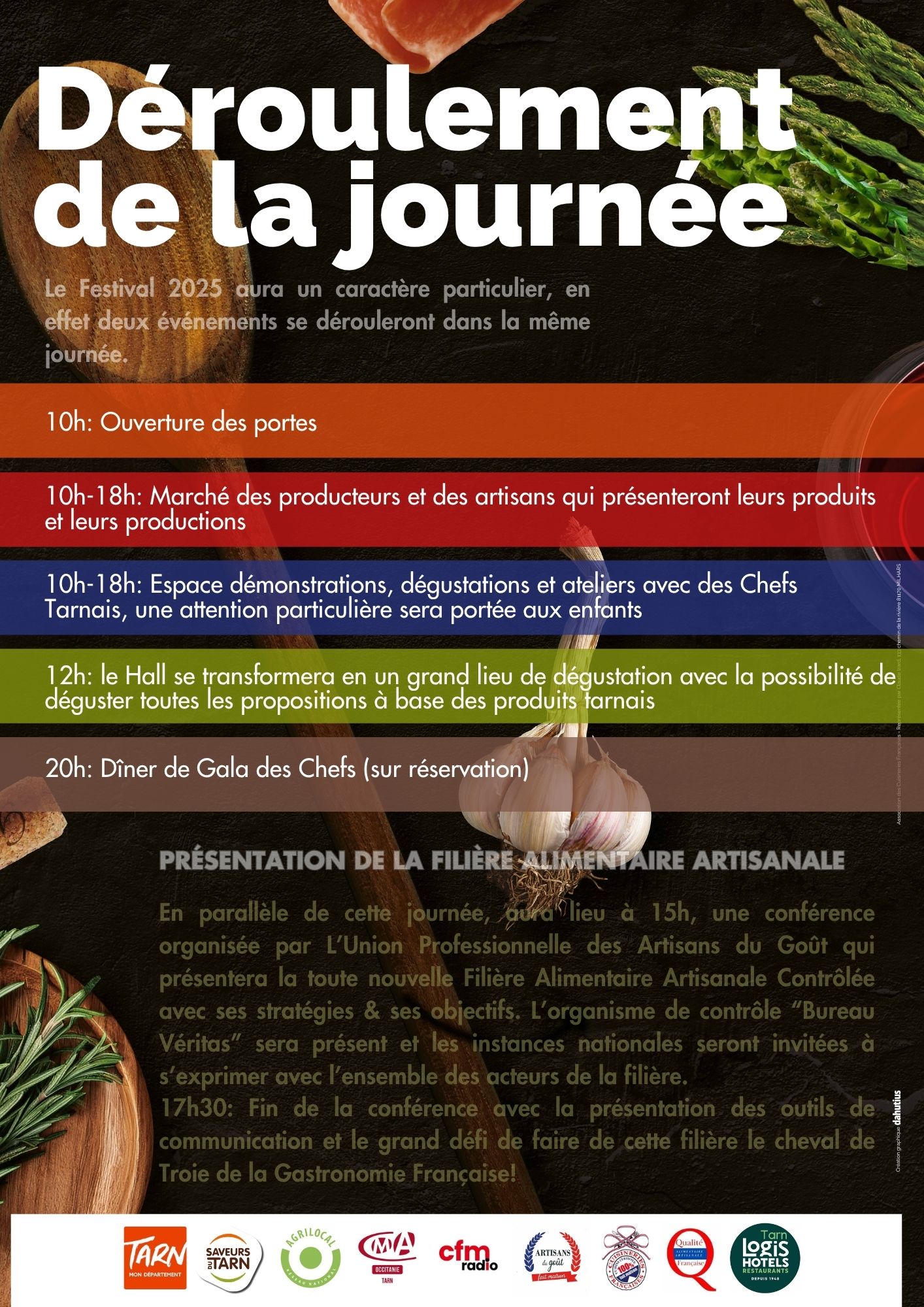 Depuis la création des Tables Gourmandes Tarnaises en 1974, puis leur évolution vers les Cuisineries Françaises en 1992, notre objectif est resté le même : valoriser le fait maison et promouvoir la filière alimentaire artisanale. Ce festival incarne notre engagement pour la qualité, l’authenticité et le savoir-faire des artisans du goût, en associant producteurs locaux, restaurateurs, chefs et artisans de bouche.