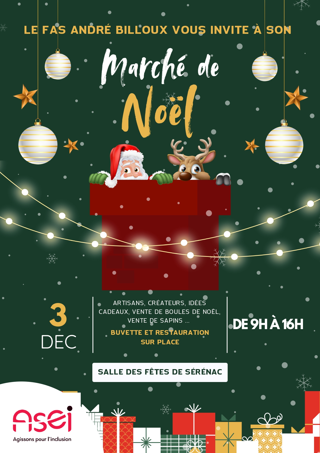 Le FAS André Billoux organise son Marché de Noël le 3 décembre à la salle des fêtes de Sérénac. Artisans, créateurs, idées cadeaux, vente de sapins et animations. Buvette et restauration sur place. De 9h à 16h. Le FAS André Billoux invite le public à son Marché de Noël organisé le 3 décembre à la salle des fêtes de Sérénac. L’événement rassemble de nombreux artisans et créateurs proposant décorations, idées cadeaux, boules de Noël et vente de sapins. Une ambiance festive est assurée avec décorations, animations et la présence d’un espace buvette et restauration disponible sur place tout au long de la journée.