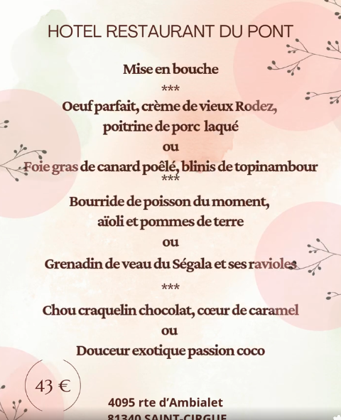Menu de Saint Valentin – Hôtel restaurant du pont Hôtel restaurant du pont 4095 route d’Ambialet La moulinquié 81340 Saint-Cirgue