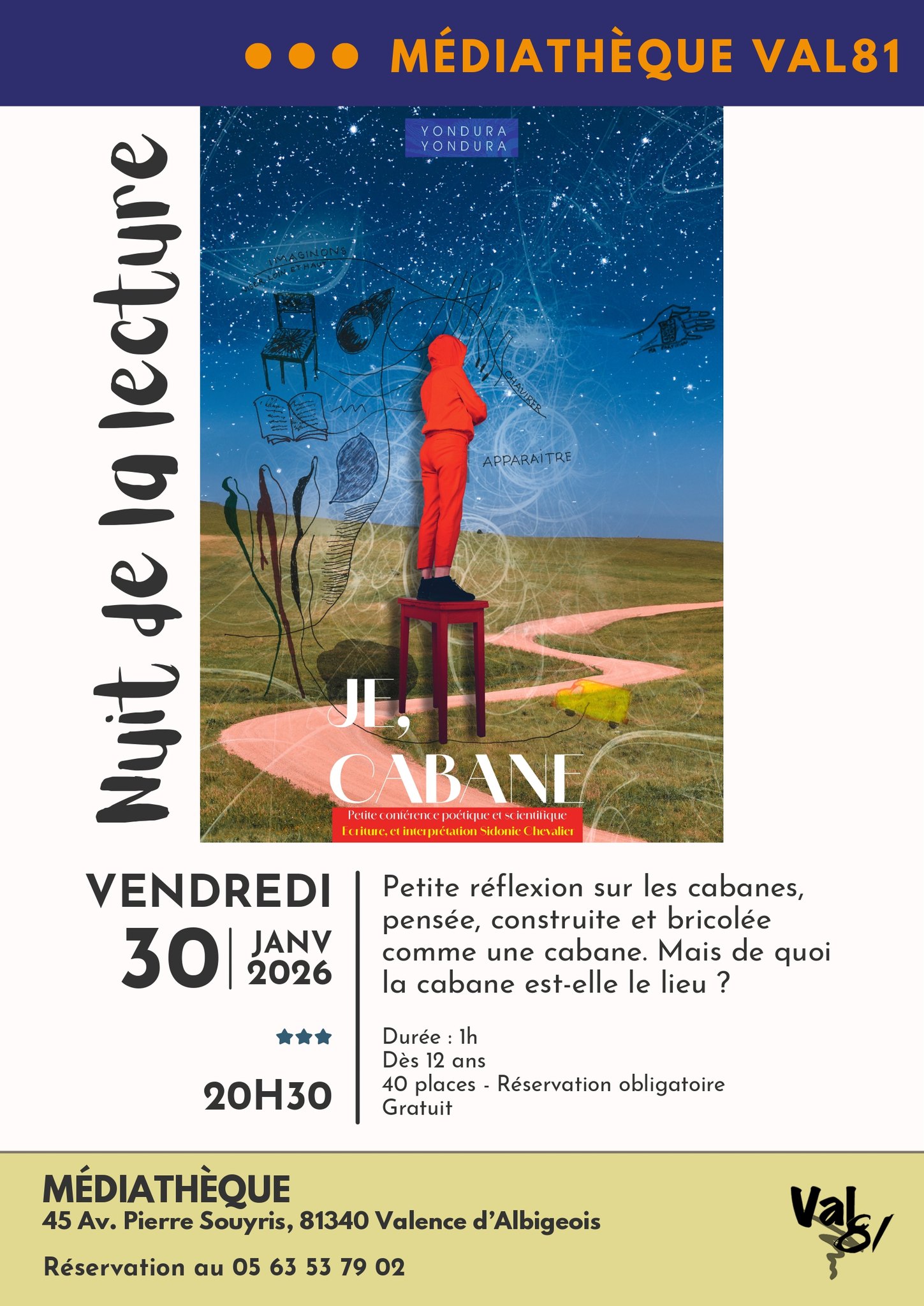 Une petite conférence poétique et scientifique autour des cabanes : pensées, construites et bricolées comme des refuges intérieurs. Un moment sensible pour réfléchir à ce que représente la cabane et à ce qu’elle abrite en nous. Réservation obligatoire. Dans le cadre de la Nuit de la lecture, la médiathèque accueille « Je, Cabane », une conférence-spectacle poétique et scientifique écrite et interprétée par Sidonie Chevalier. À partir de l’image de la cabane, l’intervenante propose une réflexion sensible et imagée : cabanes que l’on construit, que l’on imagine, que l’on habite ou que l’on rêve. La cabane devient tour à tour abri, espace de création, lieu de retrait, territoire intime ou passerelle vers le monde. Entre récit, pensée et imagination, le public est invité à se questionner : de quoi la cabane est-elle vraiment le lieu ? L’événement aura lieu le vendredi 30 janvier 2026 à 20h30, pour une durée d’une heure, et s’adresse au public dès 12 ans. La jauge est limitée à 40 personnes, sur réservation obligatoire. L’entrée est gratuite. Rendez-vous à la Médiathèque de Valence-d’Albigeois.