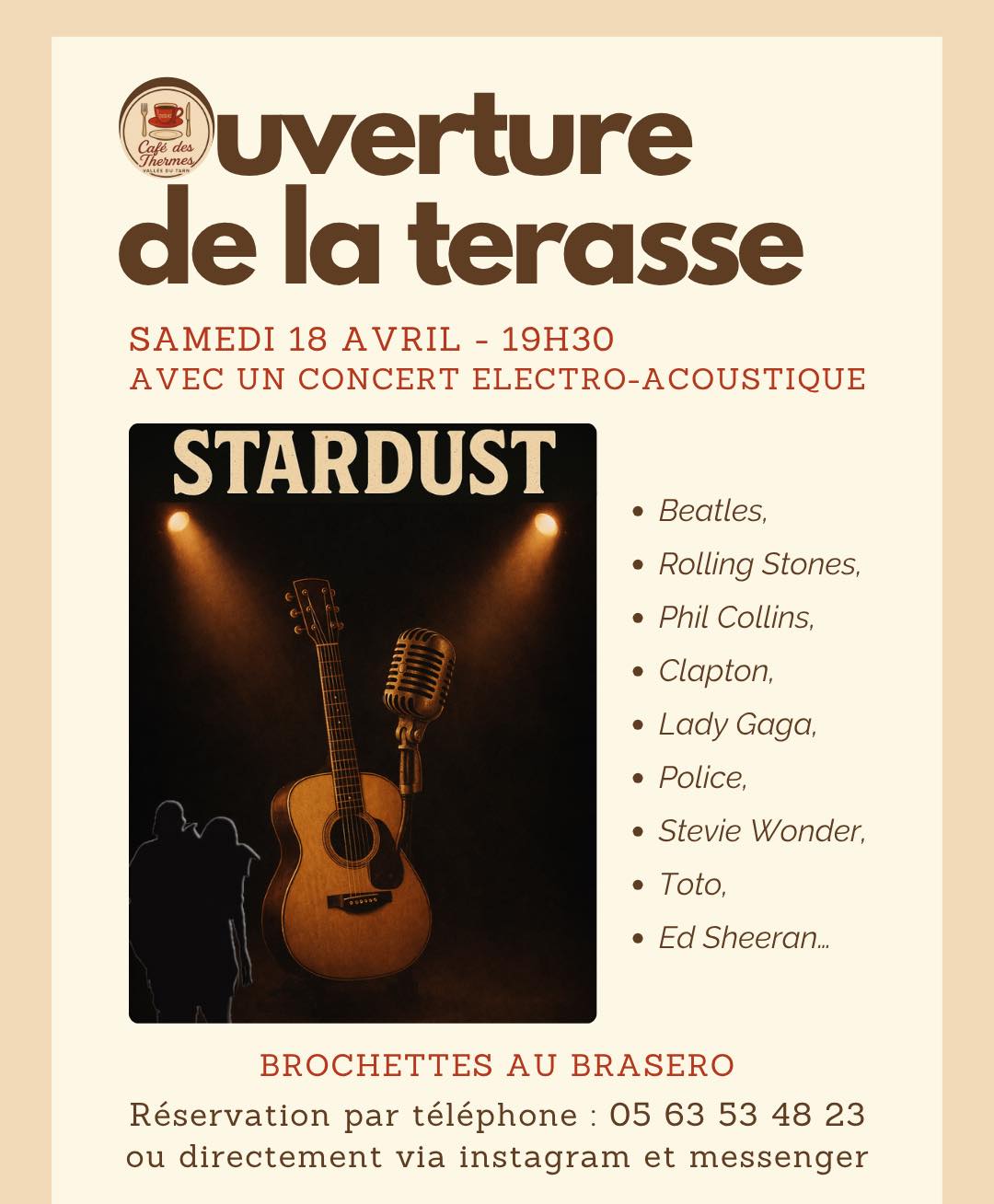 Ouverture de la terrasse du Café des Thermes, avec un concert électro-acoustique du groupe Stardust, reprenant des titres de Beatles, Rolling Stones, Phil Collins, Clapton, Lady Gaga, Police, Stevie Wonder, Toto, Ed Sheeran. Venez profiter de l’ouverture de la terrasse avec un concert électro-acoustique du groupe Stardust. Au programme, des reprises des plus grands artistes tels que les Beatles, les Rolling Stones, Phil Collins, Clapton, Lady Gaga, Police, Stevie Wonder, Toto et Ed Sheeran. Et surtout des brochettes au brasero seront également proposées. Réservation par téléphone ou via Instagram et Messenger.
