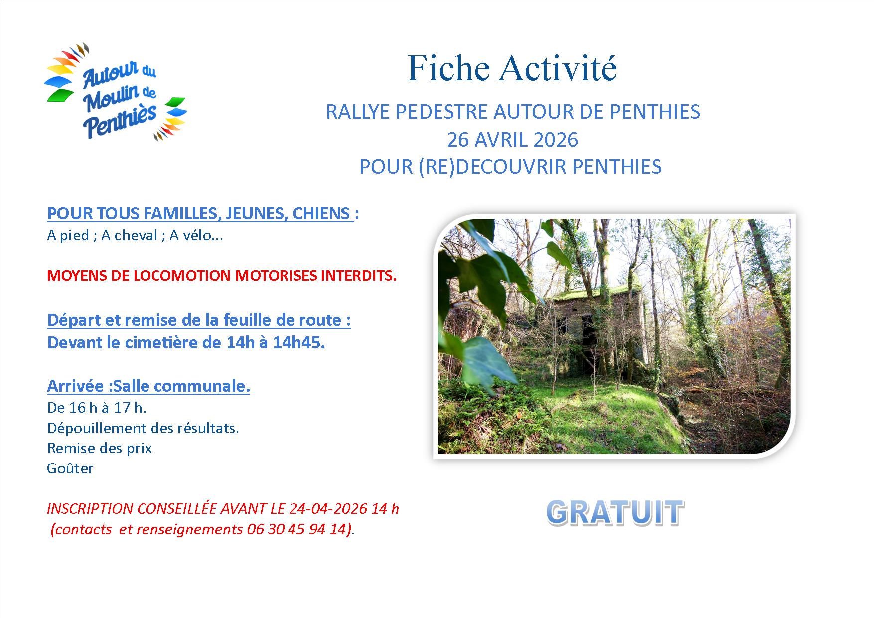 Rallye pédestre pour découvrir Penthies, ouvert à tous : familles, jeunes, chiens. Moyens de locomotion motorisés interdits. Inscription fortement conseillée Participez à un rallye pédestre autour de Penthies, une activité conviviale pour toute la famille, les jeunes et même les chiens. Le départ et la remise de la feuille de route se feront devant le cimetière de 14h à 14h45. L’arrivée est prévue à la salle communale entre 16h et 17h, où se dérouleront le dépouillement des résultats, la remise des prix et un goûter. L’inscription est conseillée avant le 24 avril 2026 à 14h. Cet événement est gratuit.