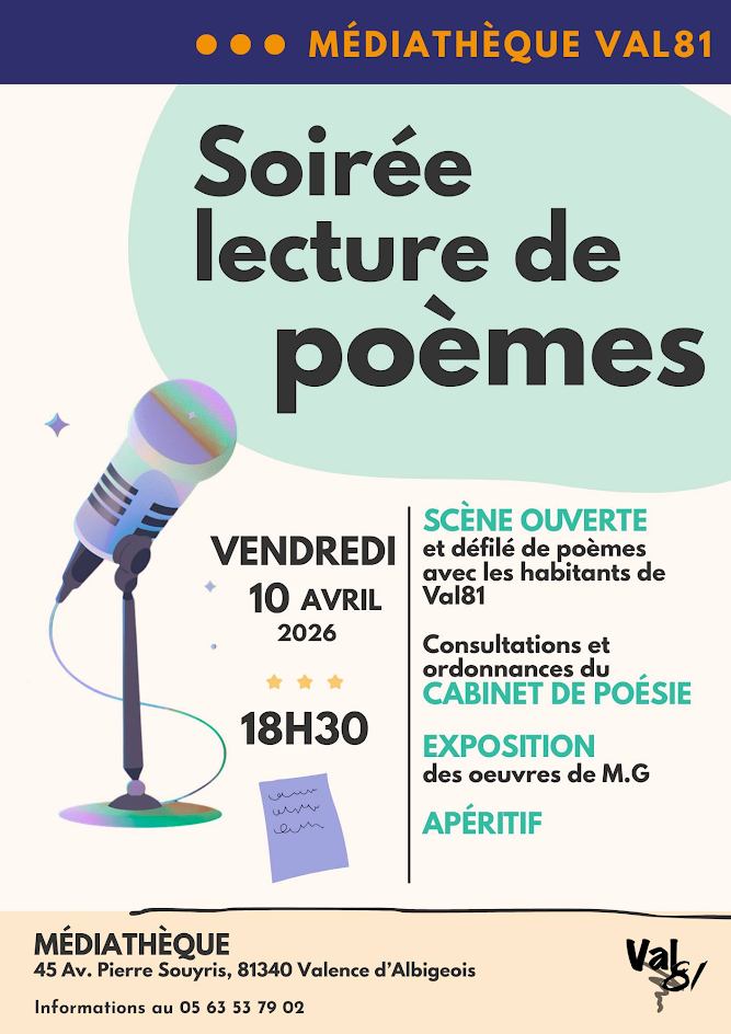 Soirée lecture de poèmes Médiathèque VAL 81avenue Pierre Souyris81340 Valence-d’Albigeois