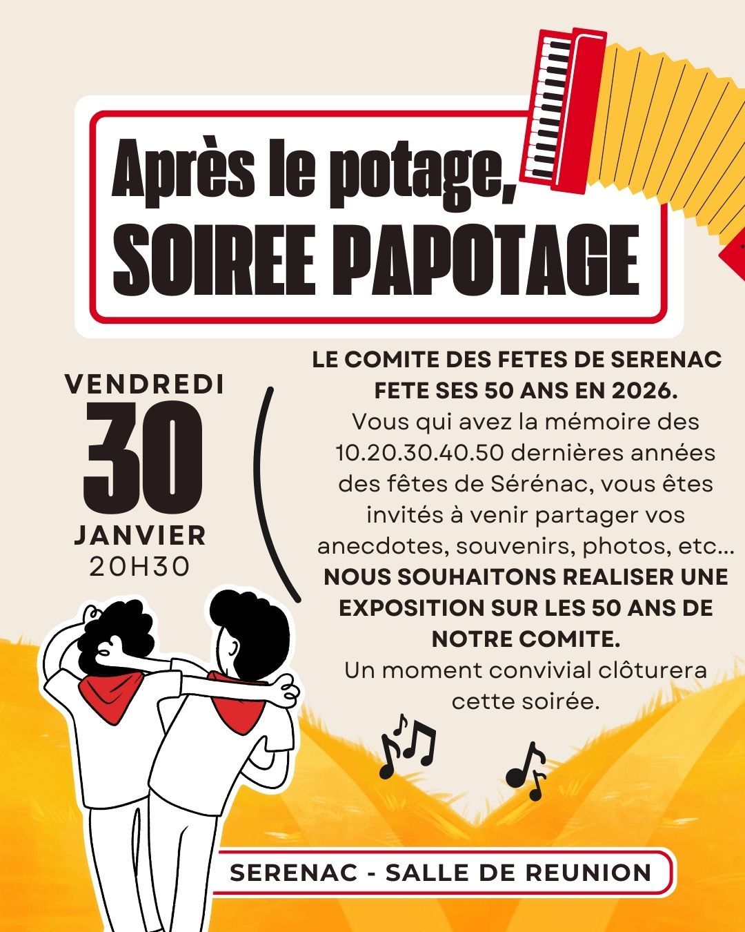 La soirée se déroulera le vendredi 30 janvier à 20h30, à la salle de réunion de Sérénac, et se clôturera par un moment convivial et chaleureux, fidèle à l’esprit festif du village.