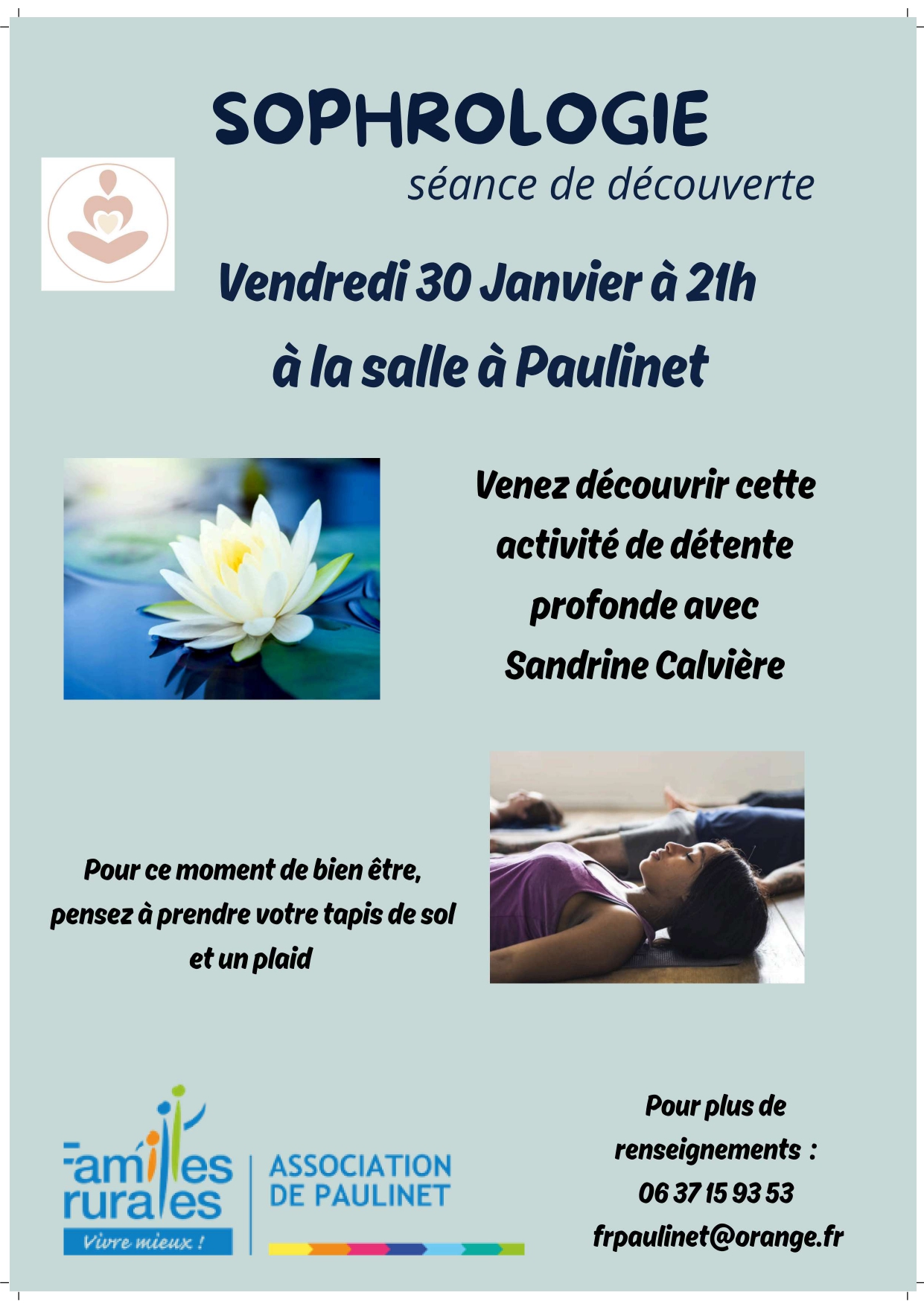 Séance de découverte de la sophrologie animée par Sandrine Calvière, le vendredi 30 janvier à 21h, à la salle de Paulinet. Un moment de détente et de bien-être ouvert à tous. L’association Familles Rurales de Paulinet propose une séance de découverte de la sophrologie le vendredi 30 janvier à 21h, à la salle de Paulinet.