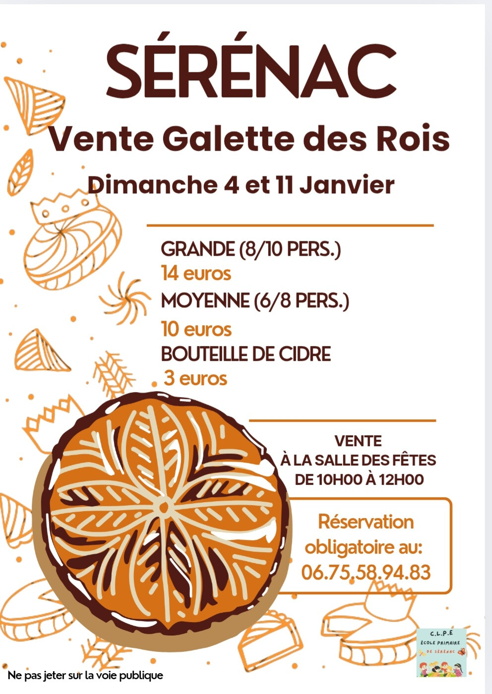Le CLPE de l’école de Sérénac organise une vente de galettes des rois les dimanches 4 et 11 janvier, de 10h à 12h à la salle des fêtes. Galettes moyennes ou grandes, et cidre en option.