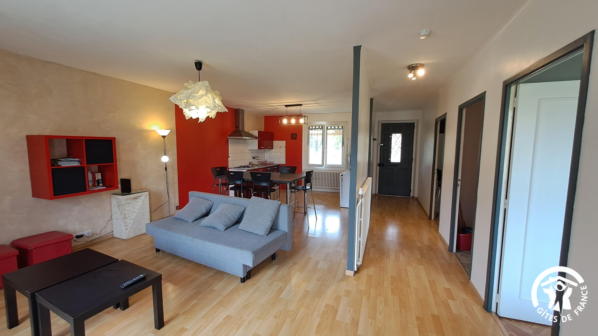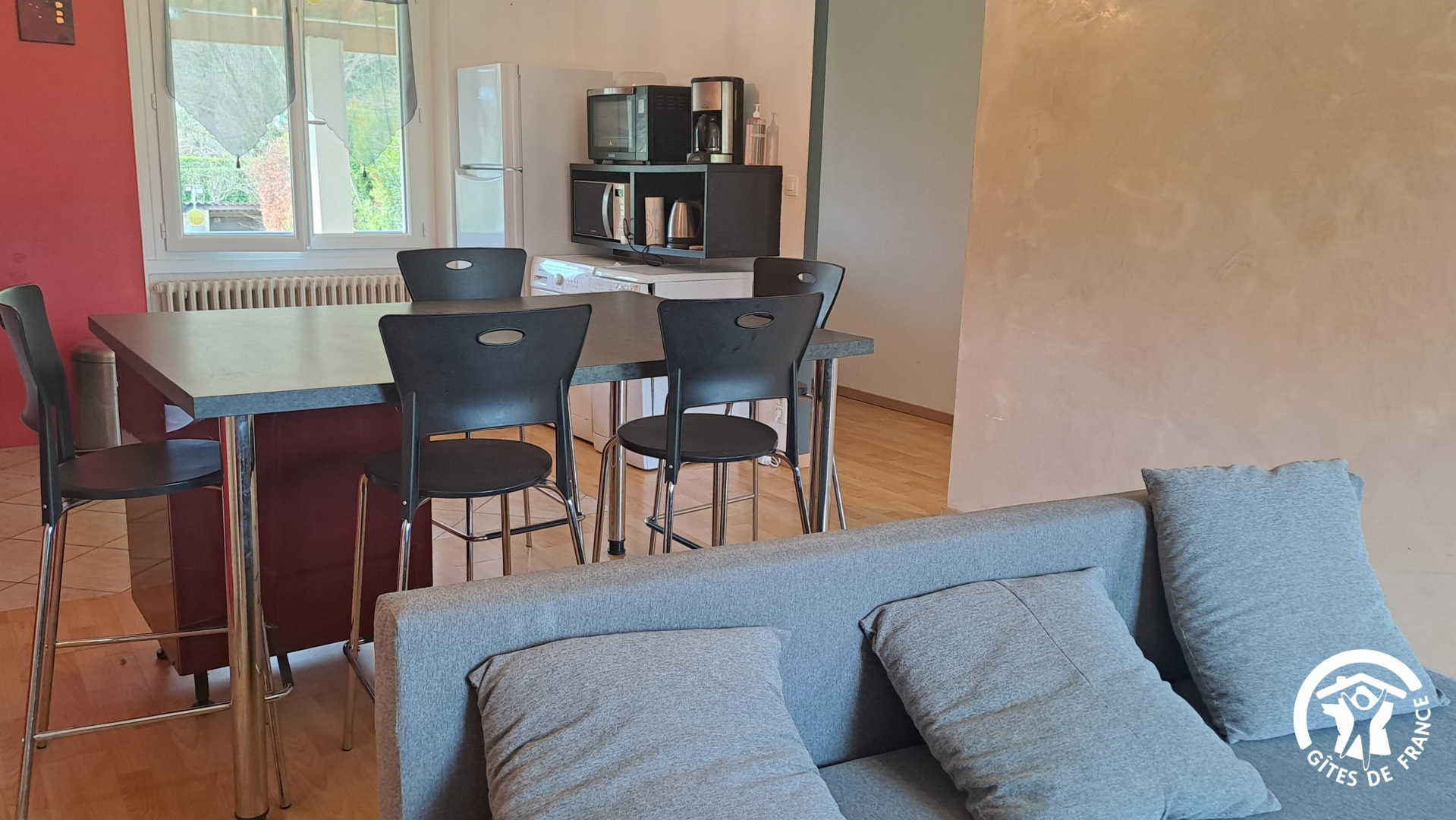Le gîte est composé d’une pièce à vivre avec cuisine équipée (îlot central, mini-four, micro ondes, lave-vaisselle, lave-linge, frigo et congélateur, bouilloire et cafetière à filtre) et coin salon avec TV, lecteur DVD et canapé convertible pouvant accueillir 2 personnes supplémentaires. Wifi. Climatisation.