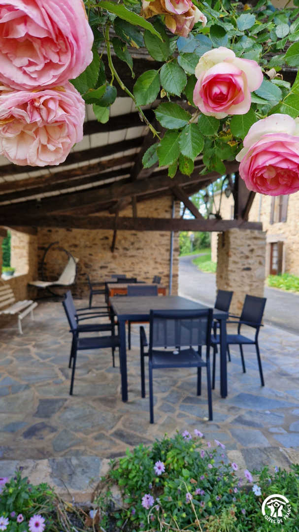 A l’extérieur : en face du gîte, une terrasse couverte avec table privative à côté des autres tables (pour les autres gîtes), accès au barbecue à bois et le tout avec une vue magnifique sur la vallée !