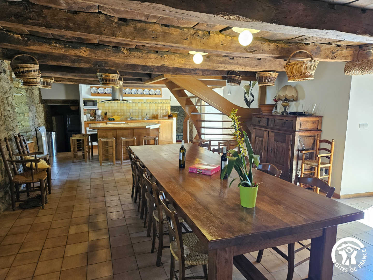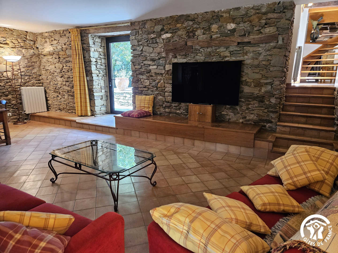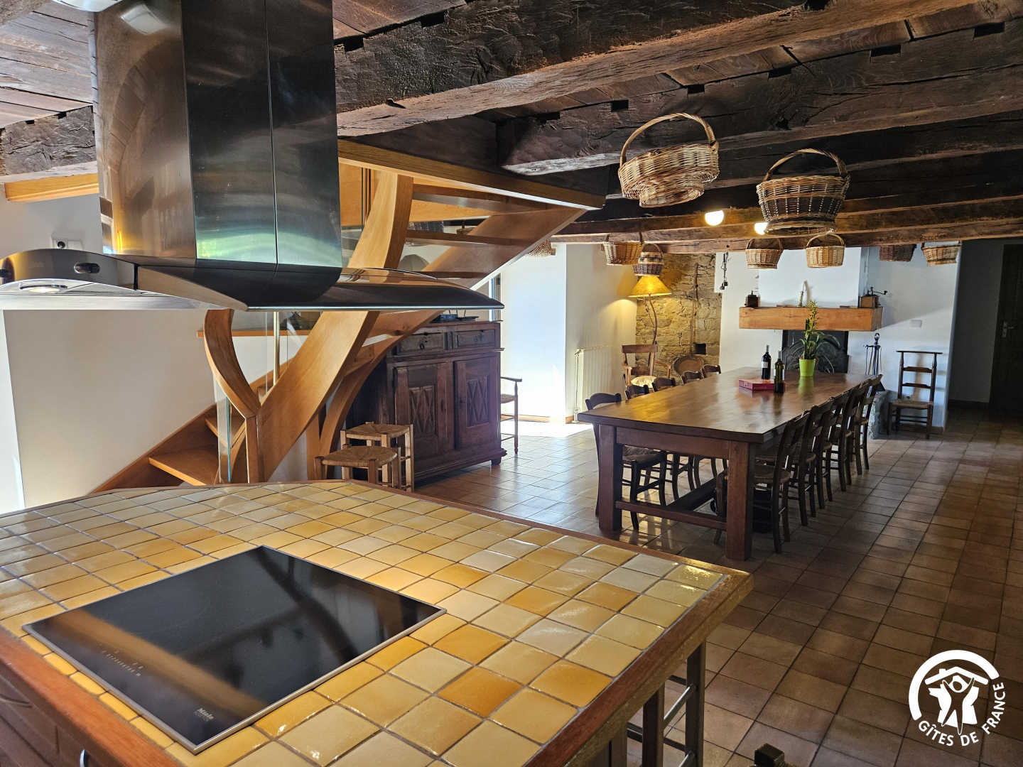 – Rez-de-chaussée : cuisine avec cheminée traditionnelle (bois fourni), séjour, chambre (un lit double en 160×200), salle d’eau, wc. Wifi (hotspot orange), écran 65 pouces OLED.