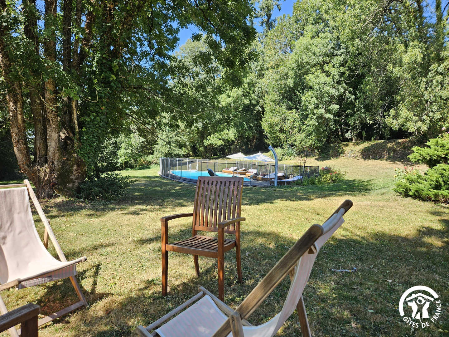 Grand jardin et belle pelouse, piscine privative, portique, terrasse offrant une vue panoramique sur la vallée de l’Ambias et les monts alentour.