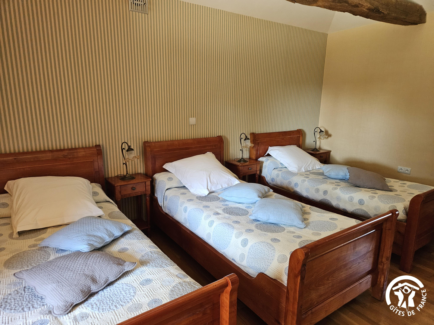 – A l’étage : trois chambres, salon de lecture, salle de bains, wc. Une chambre avec un lit double en 140×190, une avec un lit double en 160×200, la dernière pour les enfants avec trois lits simples en 90×190.