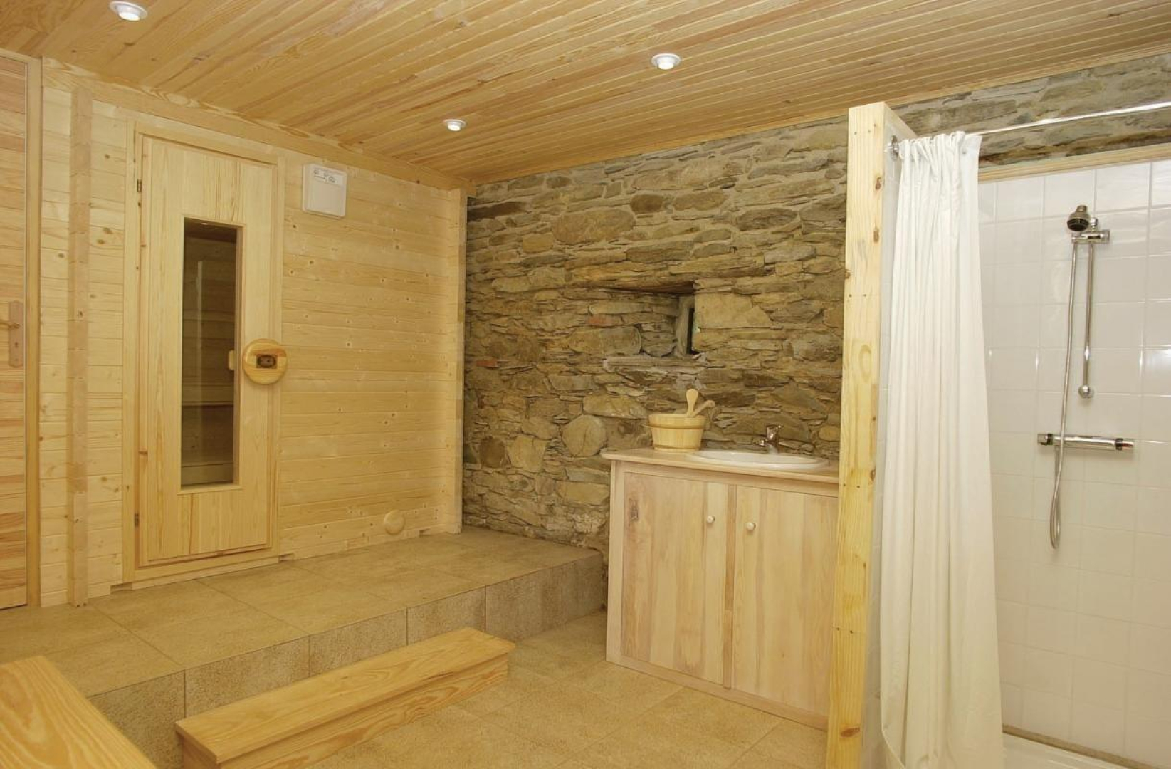 De l’autre côté, donnant sur la cour, agréable sauna 4 places avec douche, abri voitures.
