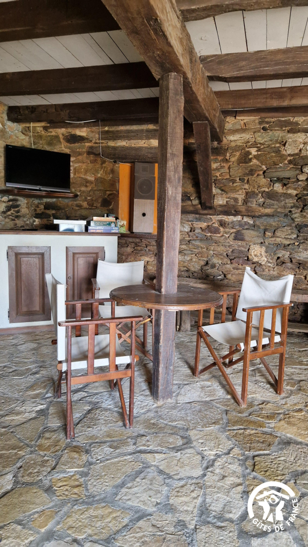 A l’extérieur : en face du gîte, une terrasse ombragée avec table privative à côté des autres tables (pour les autres gîtes), accès au barbecue à bois et le tout avec une vue magnifique sur la vallée !