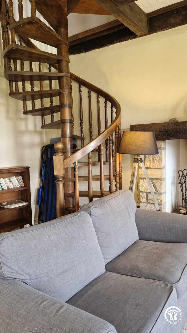 Accès à l’étage par un escalier en colimaçon depuis la pièce de vie. L’étage est accessible de plain-pied depuis la route à l’extérieur :