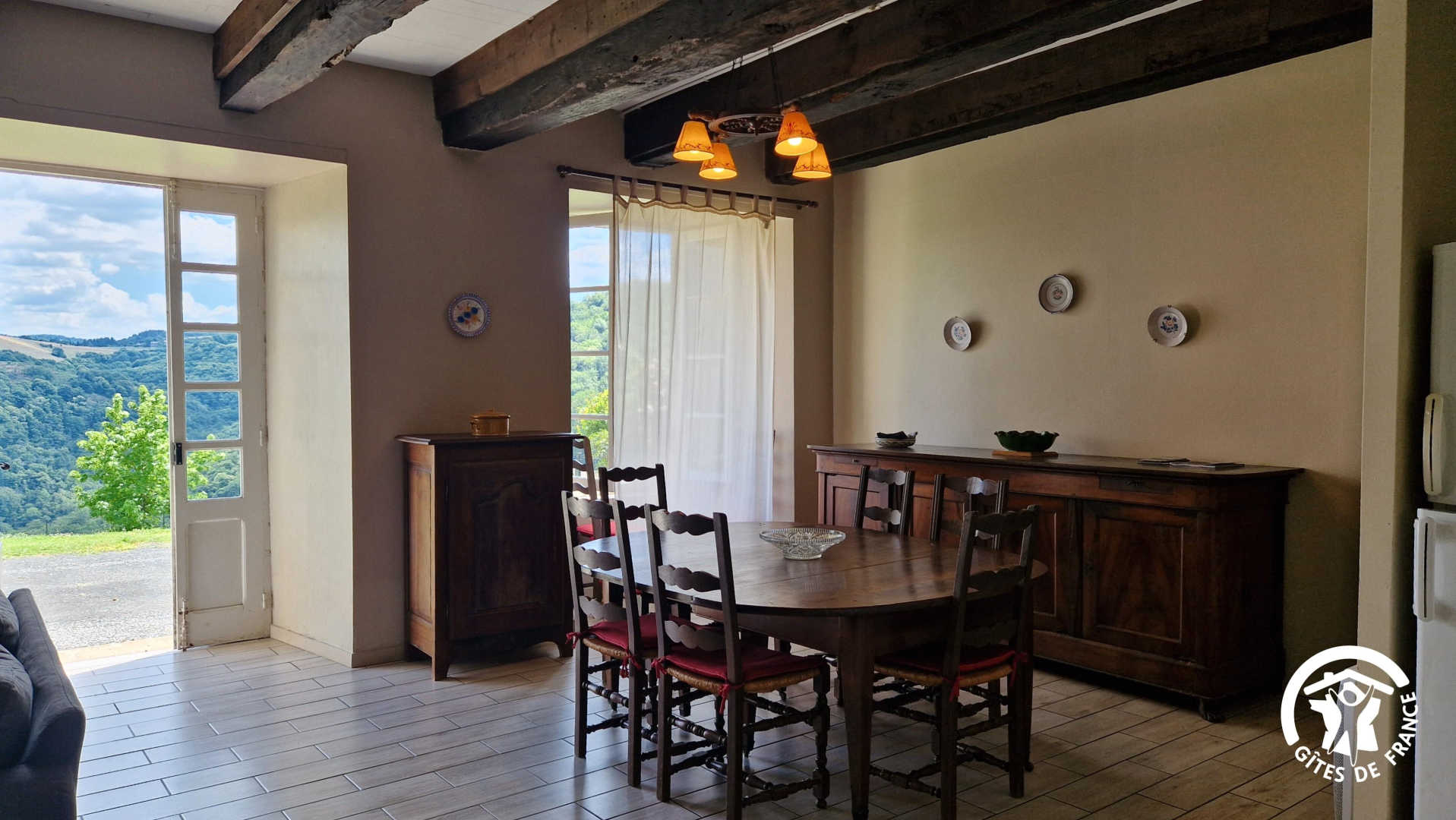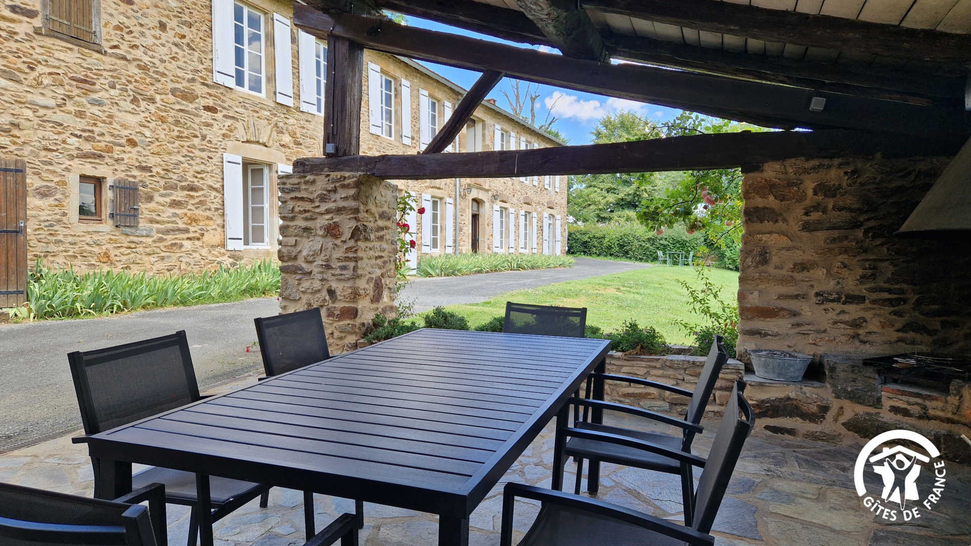 A l’extérieur, en face du gîte, une terrasse couverte avec table privative à côté des autres tables (pour les autres gîtes), accès au barbecue à bois et le tout avec une vue magnifique sur la vallée !
