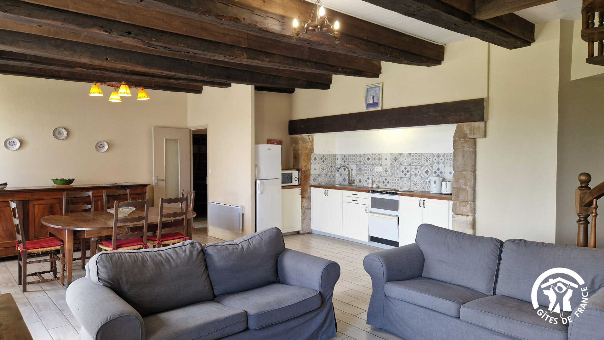 – pièce de vie avec espace salon TV et cheminée, table à manger en bois et cuisine ouverte : micro-ondes, bouilloire, cafetière à filtre et Senseo, grille-pain, réfrigérateur-congélateur, bloc gazinière avec petit four et petit lave-vaisselle.