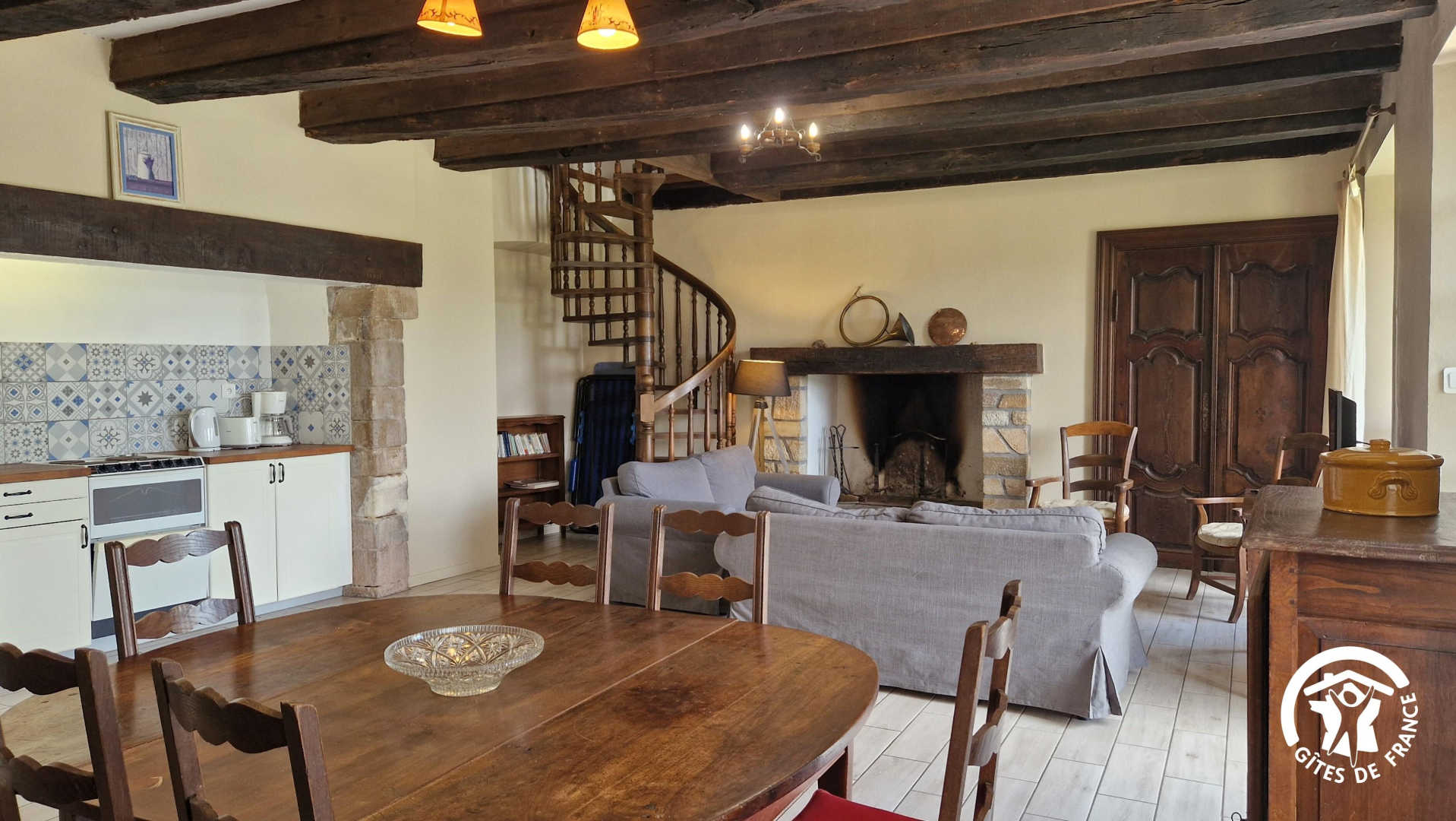 – pièce de vie avec espace salon TV et cheminée, table à manger en bois et cuisine ouverte : micro-ondes, bouilloire, cafetière à filtre et Senseo, grille-pain, réfrigérateur-congélateur, bloc gazinière avec petit four et petit lave-vaisselle.