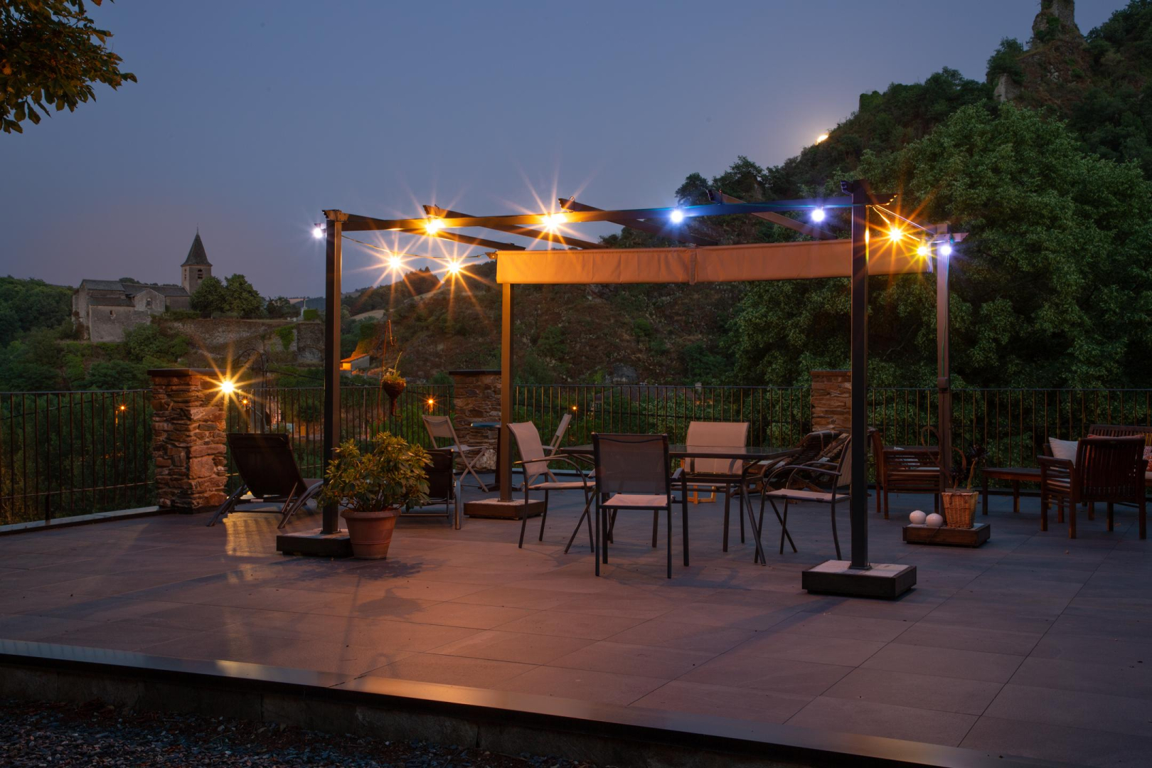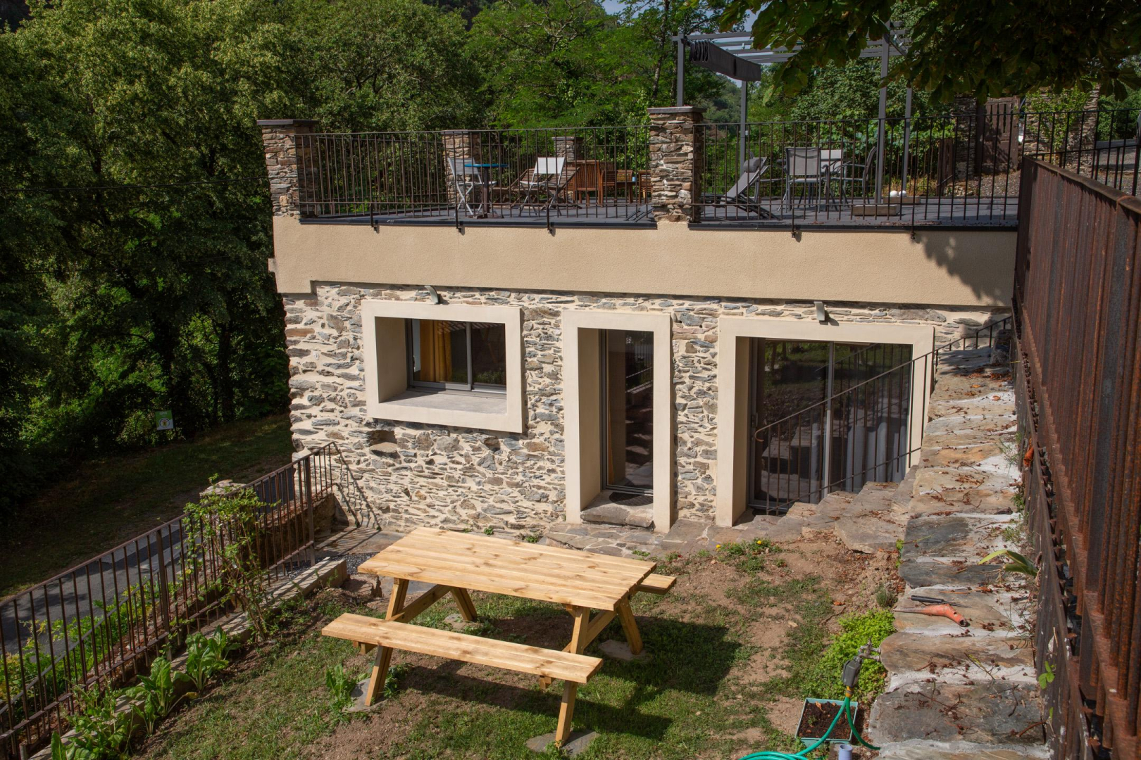 Deux terrasses partagées, l’une côté jardin et l’autre de 100m² dominant la vallée.