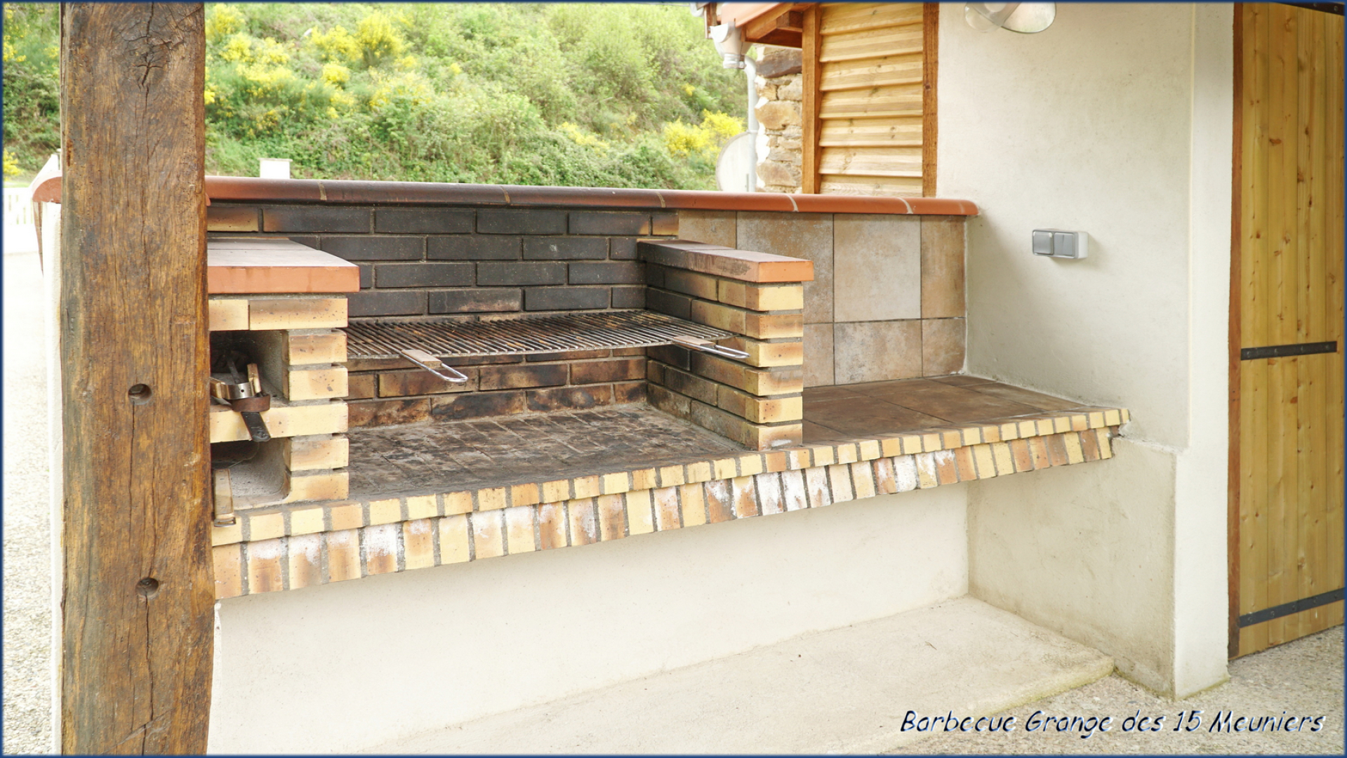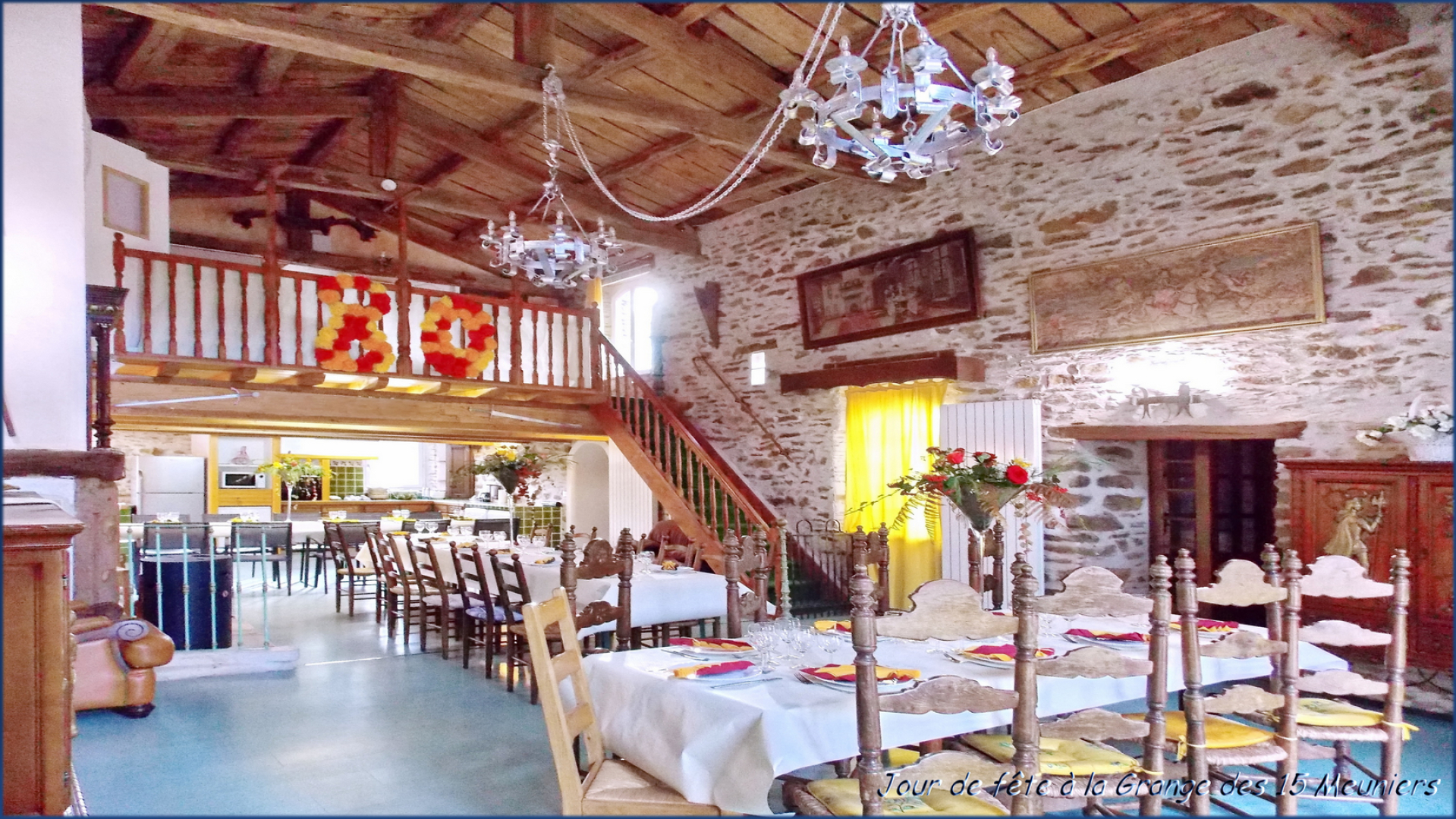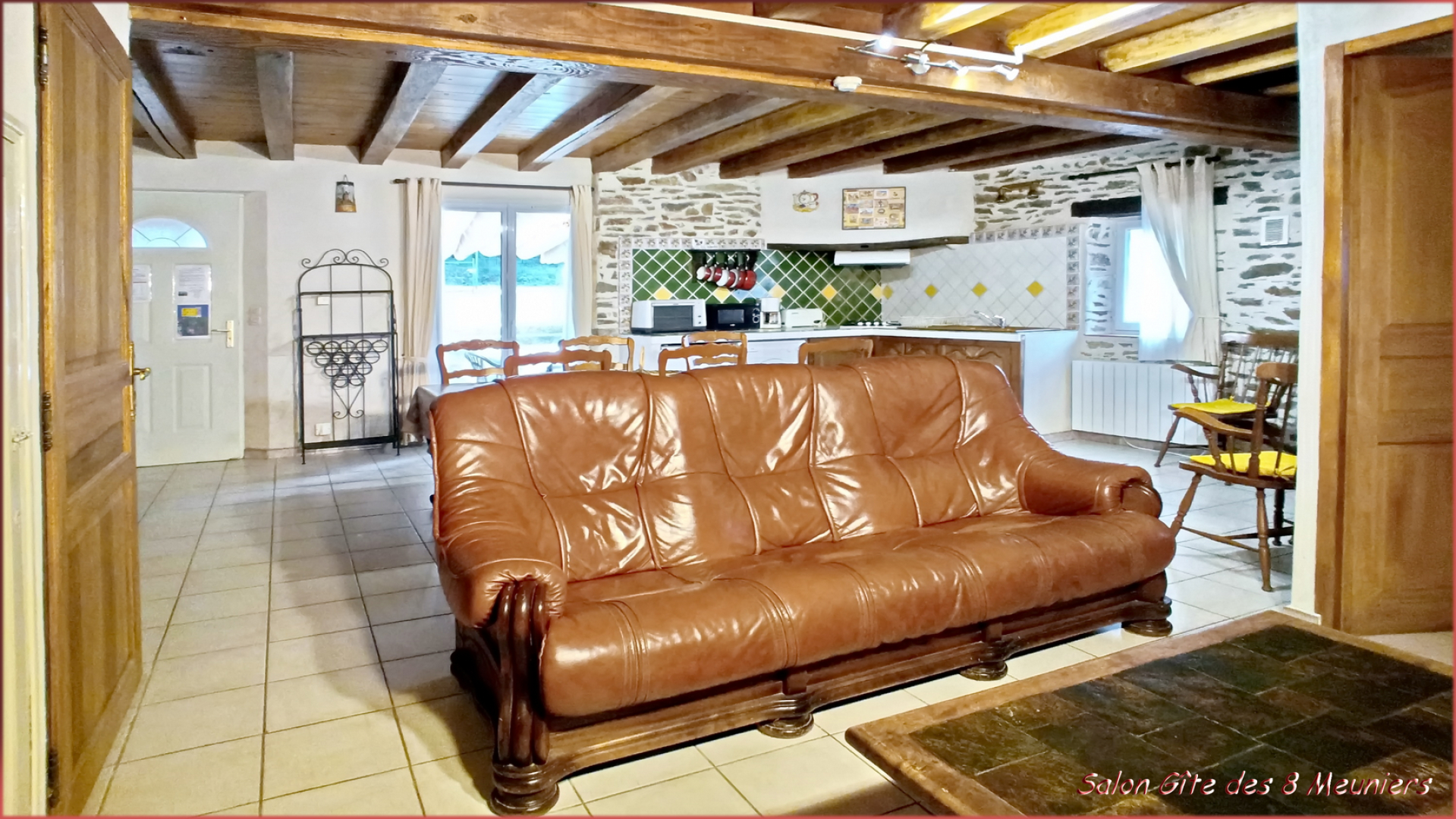 • Gîte des 15 Meuniers : grande pièce à vivre avec cuisine ouverte équipée (four, micro-ondes, lave-vaisselle, réfrigérateur-congélateur, plaque vitrocéramique, cafetière filtre), espace repas et salon avec cheminée et télévision.