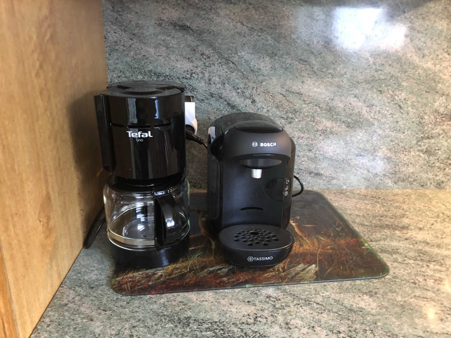 Cuisine indépendante toute équipée (machine à café Tassimo) avec table pour 6 et vue sur le grand jardin.
