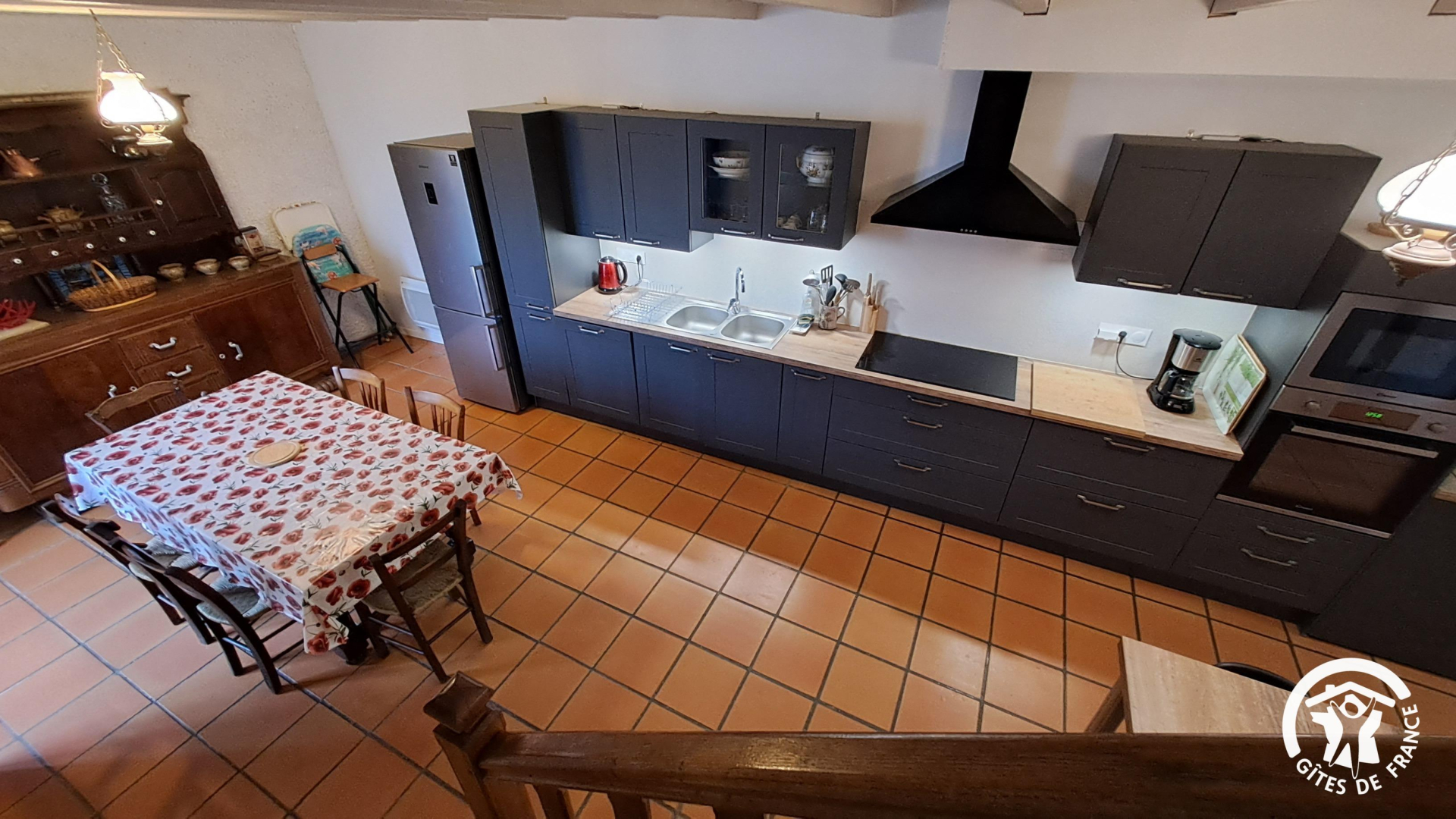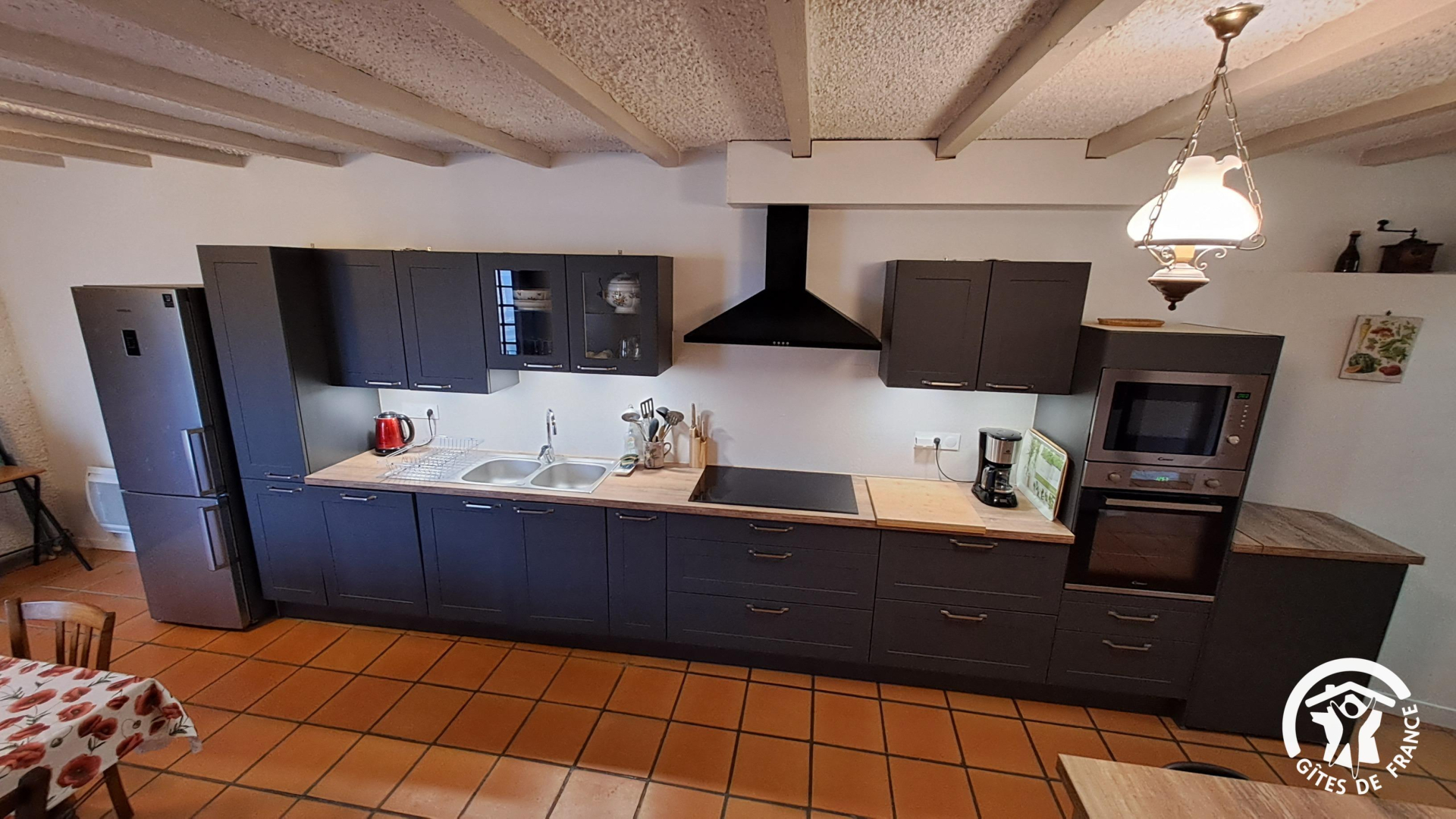 Au rez-de-chaussée : Une belle grande cuisine entièrement équipée (plaque à induction, four, lave-vaisselle, four micro-ondes, bouilloire, hotte aspirante, réfrigérateur et congélateur, lave-linge, cafetière électrique …). Sur le même pallier, des toilettes.