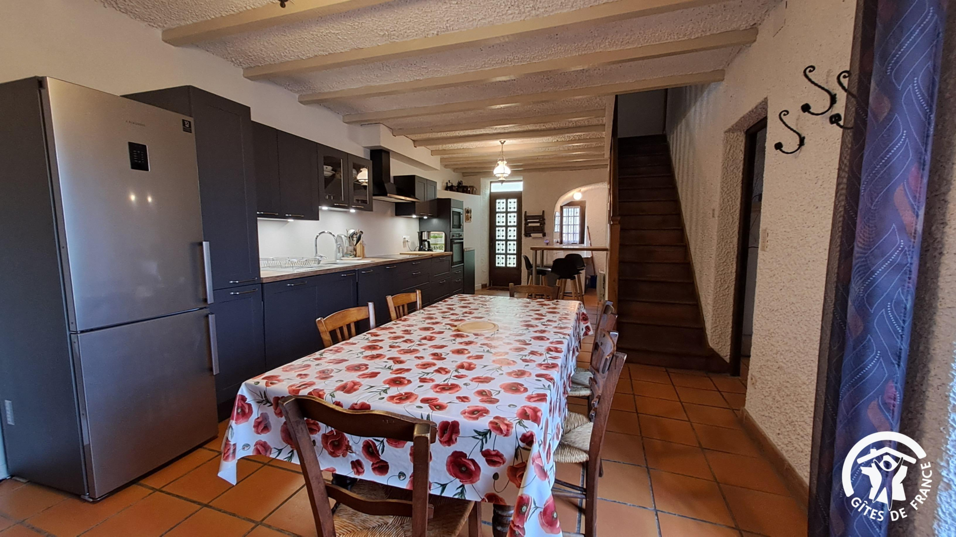 Maison spacieuse redivisée pour accueillir 4 personnes, dans le tout petit village paisible de Fraissines. Gîte à l’étage, accès par un escalier extérieur donnant sur la terrasse.